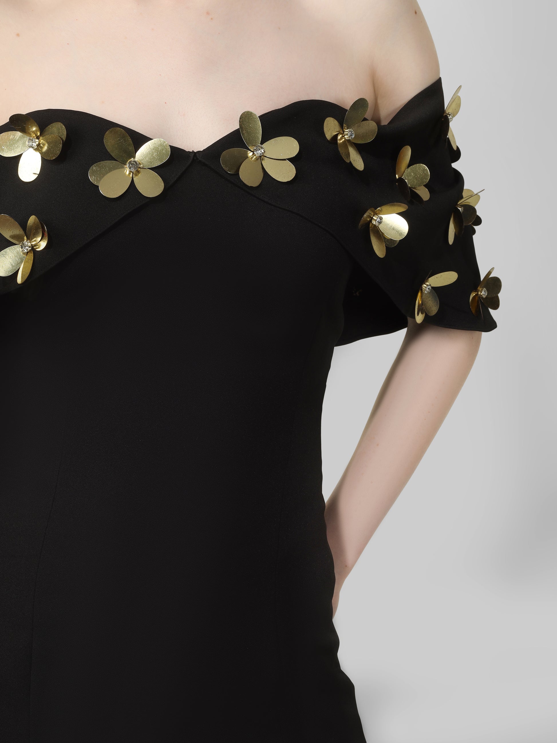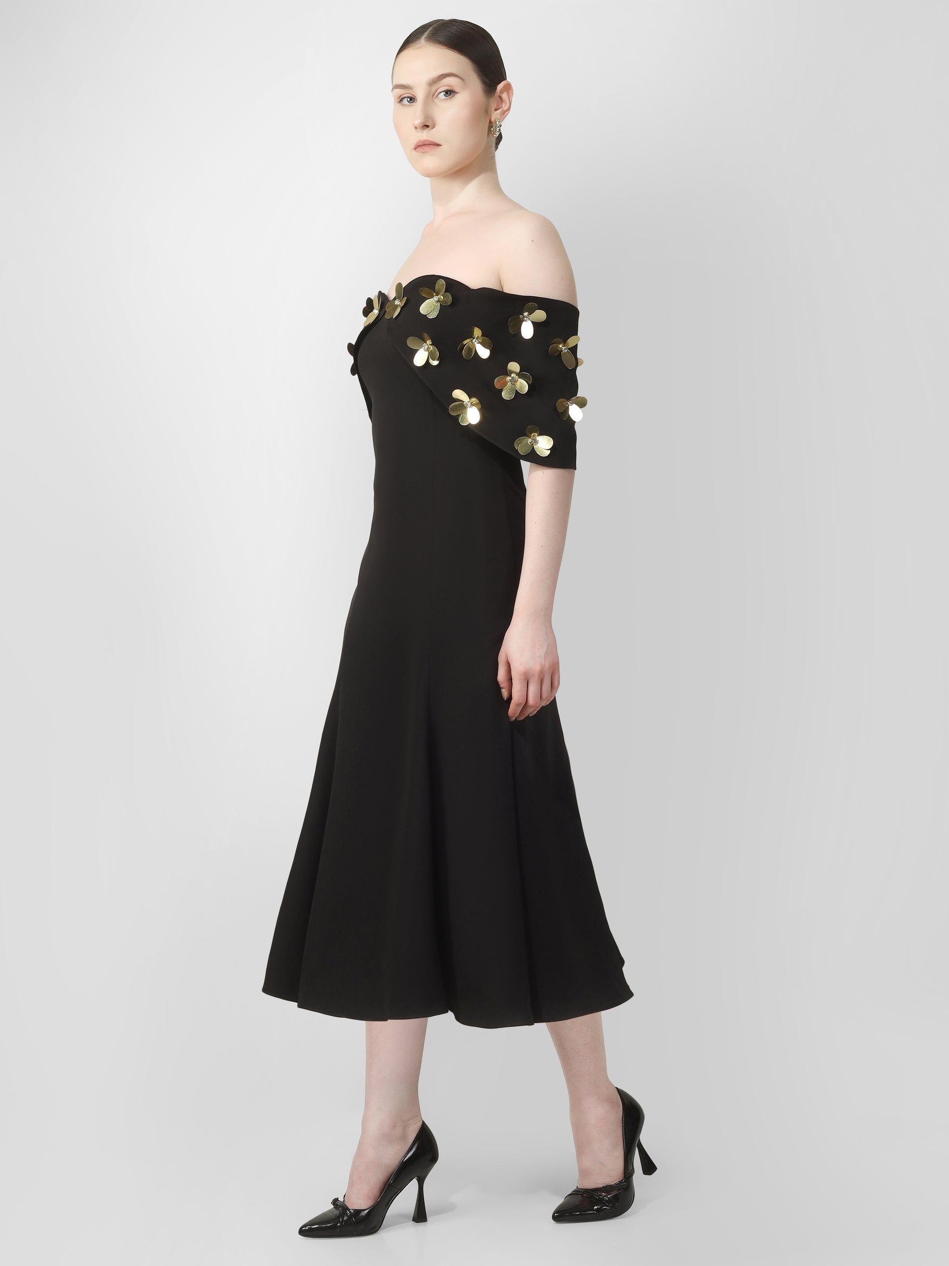 Black Off-Shoulder Embellished Midi Dress